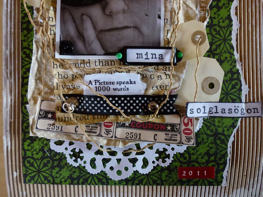 Jag har också fått användning för en metallram som man kan stoppa ett ord i... i det här fallet ordet "mina". För att inte låta det gröna bakgrundspapperet agera allena, valde jag att sätta i gröna brads (jungfruben/påsnitar). Jag har också satt i en silver-drag-sak och en stor silverbrad för att fästa prickbandet.