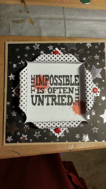 Sedan stansade jag ut en likadan form i svart papper med pop up-delen, som jag sedan fortsatte att dekorera genom att stansa fram en kugghjulskant på den med Tim Holtz